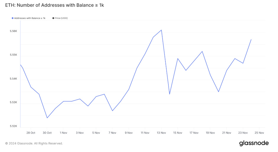 The number of Ethereum whales holding at least 1,000 ETH has rebounded to 5,557, nearing its monthly peak of 5,561. This suggests renewed confidence among large holders, which often signals price stability or upward trends.