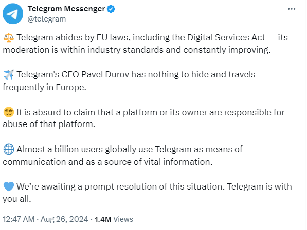 Telegram's Response: Telegram questioned the legitimacy of the arrest, arguing that the app complies with European regulations and that the charges against Durov are baseless.
