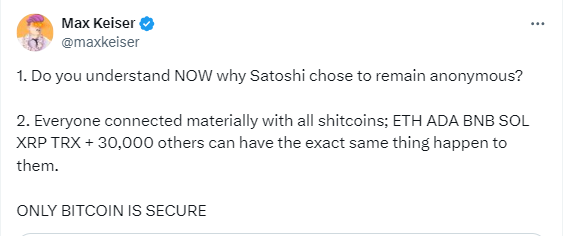 Max Keiser has expressed concerns about Bitcoin’s vulnerability following the arrest of Pavel Durov, the Telegram founder. Keiser believes Bitcoin is the only truly secure cryptocurrency and views altcoins like XRP and ADA as more susceptible to legal challenges.