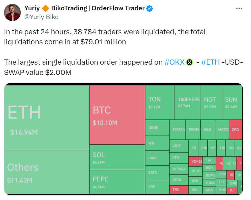 Liquidations: $80 million in the past 24 hours, predominantly affecting long positions.